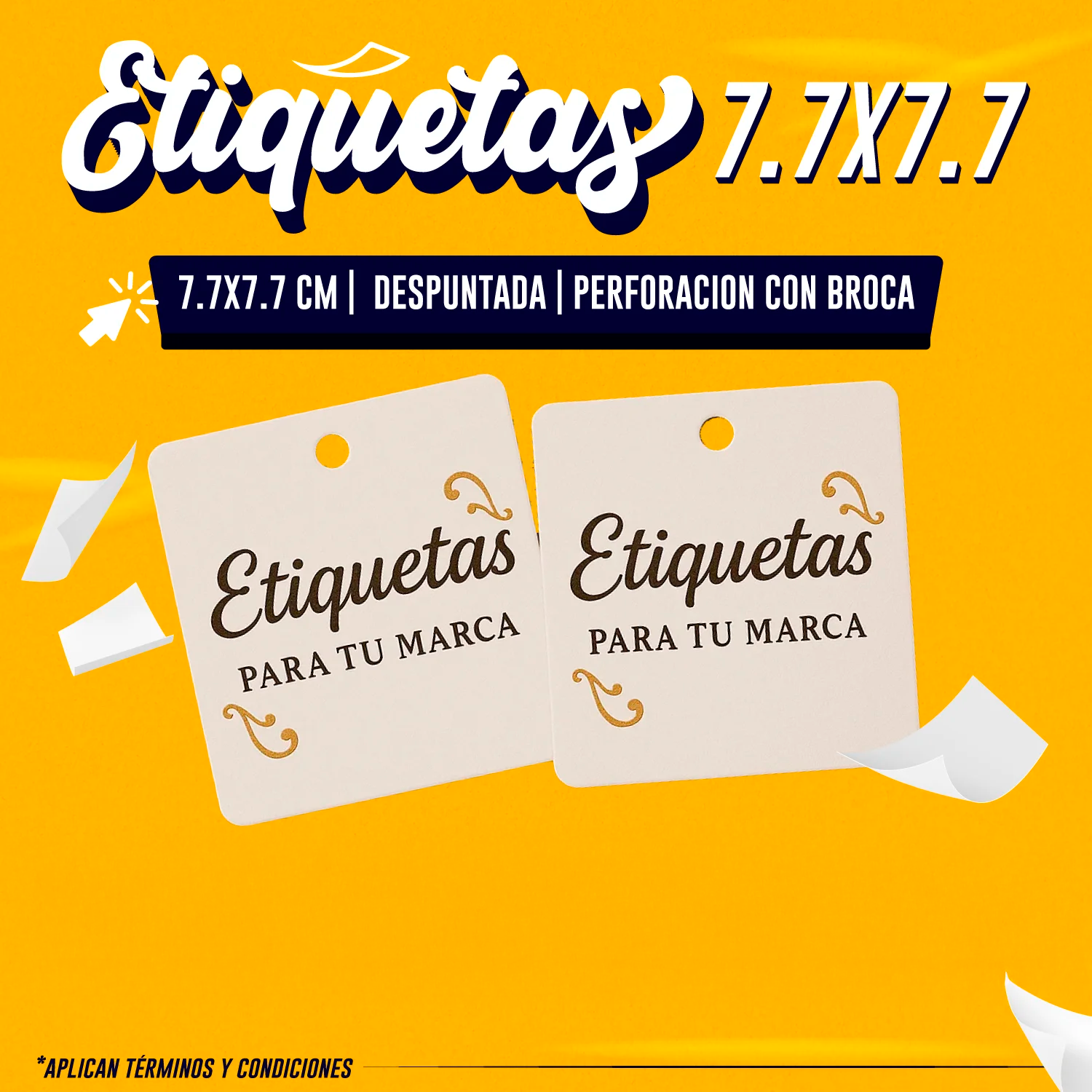 Etiqueta cuadrada de 7.7 × 7.7 cm con esquinas despuntadas para un toque moderno y un orificio perforado con broca que te permite colgarla al instante. El laminado mate frontal le da resistencia contra arañazos y humedad, asegurando que tu marca luzca impecable en cualquier entorno.